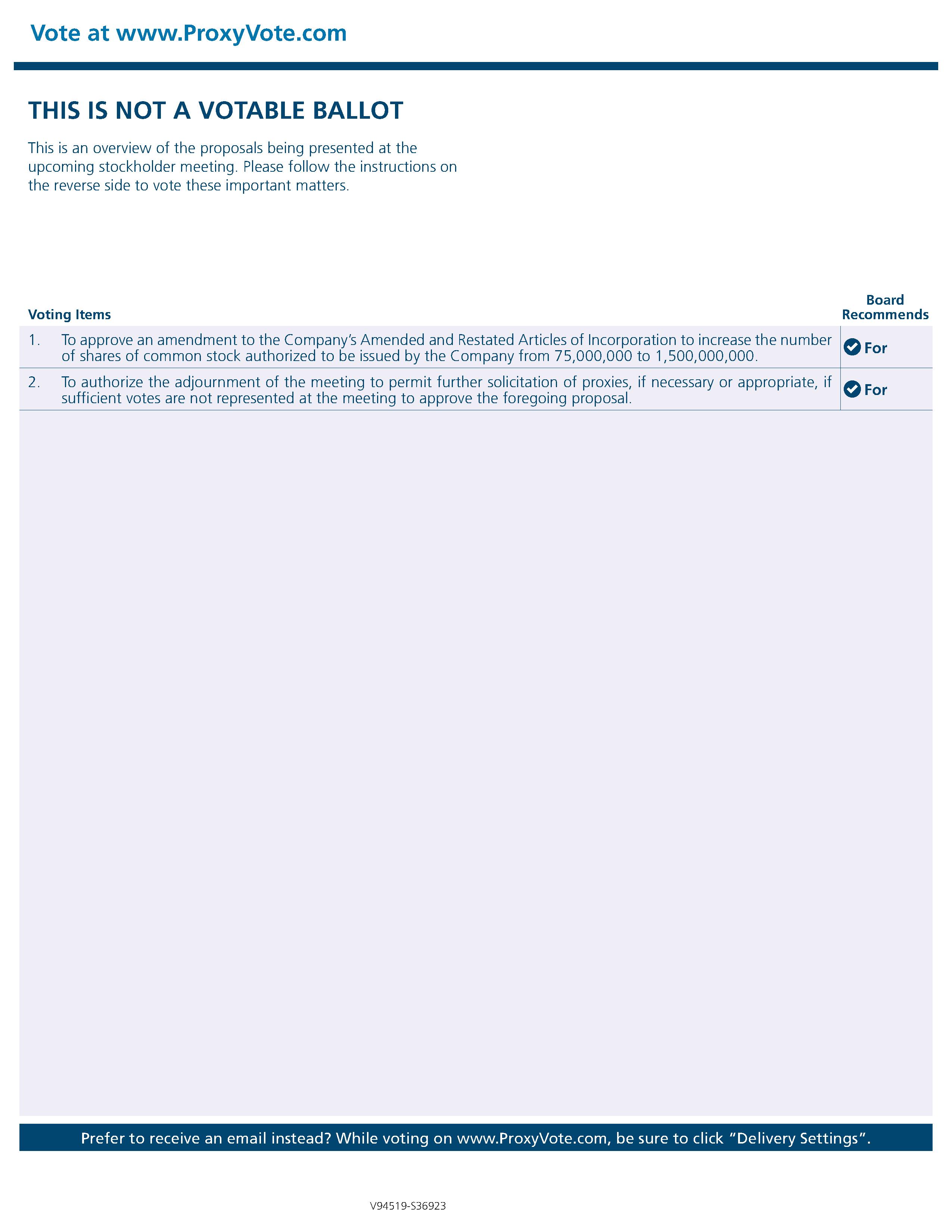 - To amend the Company’s Amended and Restated Articles of Incorporation to increase the number of authorized shares of common stock from 75,000,000 to 1,500,000,000, as discussed in the Company’s proxy statement.