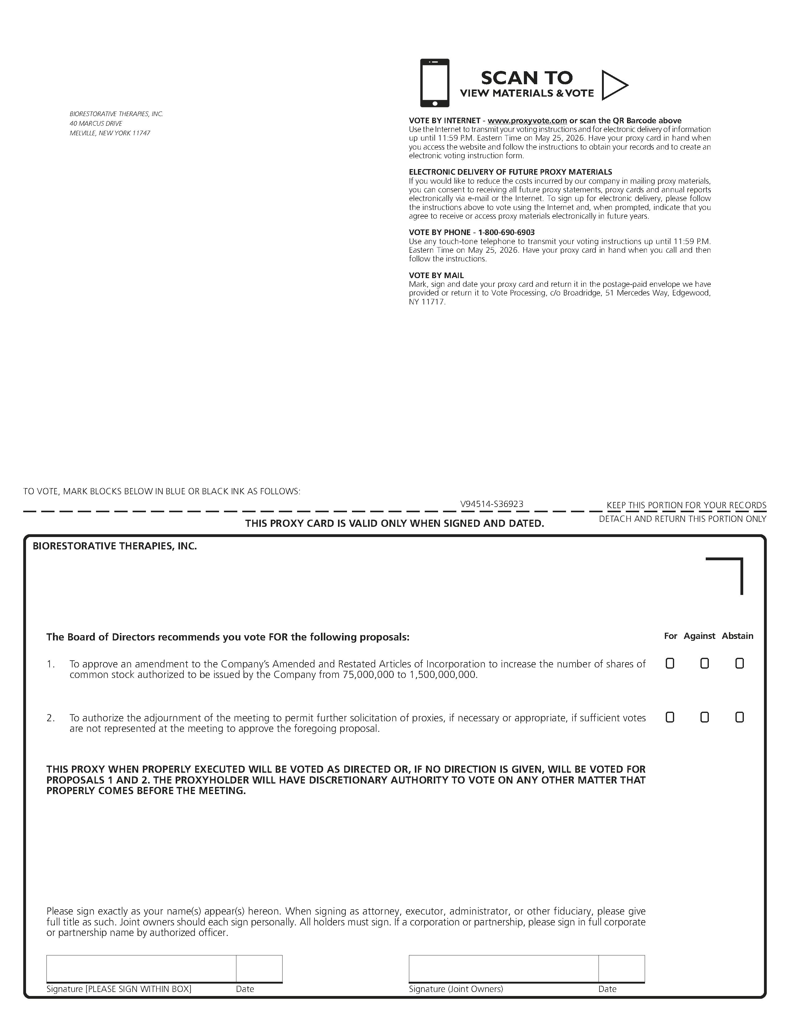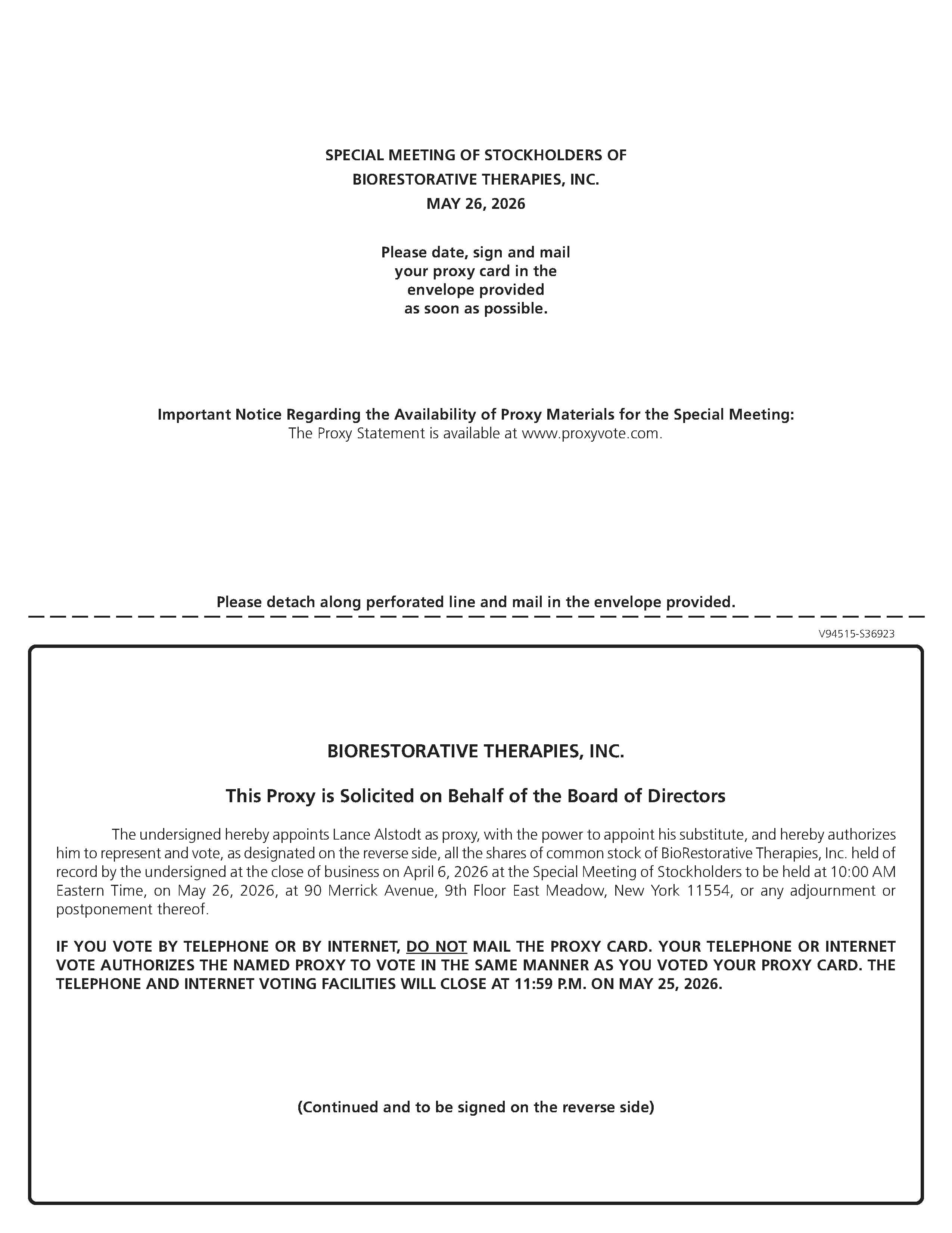 NOTICE IS HEREBY GIVEN that a Special Meeting of Stockholders of BioRestorative Therapies, Inc., a Nevada corporation (the “Company”), will be held on May 26, 2026 at 90 Merrick Avenue, 9th Floor, East Meadow, New York, at 10:00 a.m., local time, for the following purposes:
