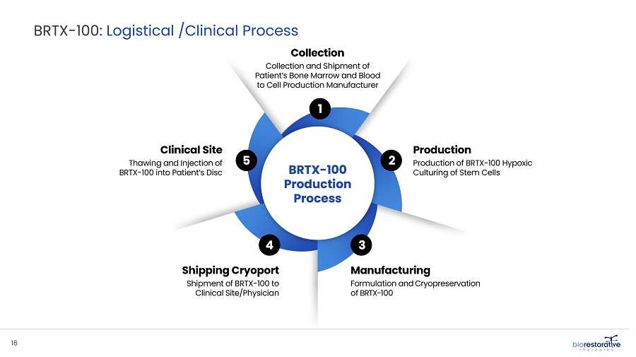 ● Disc/Spine Program (brtxDisc). Our lead cell therapy candidate, BRTX-100, is a product formulated from autologous (or a person’s own) cultured mesenchymal stem cells collected from the patient’s bone marrow. We intend that the product will be used for the non-surgical treatment of painful lumbosacral disc disorders or as a complimentary therapeutic to a surgical procedure. The BRTX-100 production process utilizes proprietary technology and involves collecting a patient’s bone marrow, isolating and culturing stem cells from the bone marrow and cryopreserving the cells. In an outpatient procedure, BRTX-100 is injected by a physician into the patient’s damaged disc. The treatment is intended for patients whose pain has not been alleviated by non-surgical procedures and who potentially face the prospect of surgery. We are conducting a Phase 2 clinical trial using BRTX-100 to treat chronic lower back pain arising from degenerative disc disease. We have also obtained U.S. Food and Drug Administration (“FDA”) Investigational New Drug (“IND”) clearance to evaluate BRTX-100 in the treatment of chronic cervical discogenic pain.