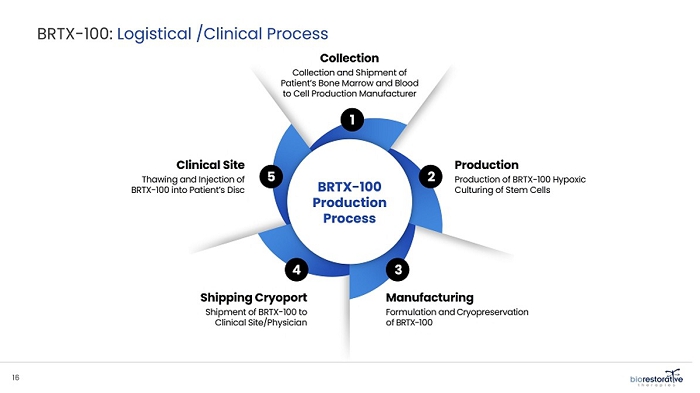 | ● | Disc/Spine Program (brtxDisc). Our lead cell therapy candidate, BRTX-100, is a product formulated from autologous (or a person’s own) cultured mesenchymal stem cells, or MSCs, collected from the patient’s bone marrow. We intend that the product will be used for the non-surgical treatment of painful lumbosacral disc disorders or as a complimentary therapeutic to a surgical procedure. The BRTX-100 production process utilizes proprietary technology and involves collecting a patient’s bone marrow, isolating and culturing stem cells from the bone marrow and cryopreserving the cells. In an outpatient procedure, BRTX-100 is injected by a physician into the patient’s damaged disc. The treatment is intended for patients whose pain has not been alleviated by non-surgical procedures and who potentially face the prospect of surgery. We have commenced a Phase 2 clinical trial using BRTX-100 to treat chronic lower back pain arising from degenerative disc disease. We have also obtained FDA IND clearance to evaluate BRTX-100 in the treatment of chronic cervical discogenic pain. See “Disc/Spine Program” below. | |