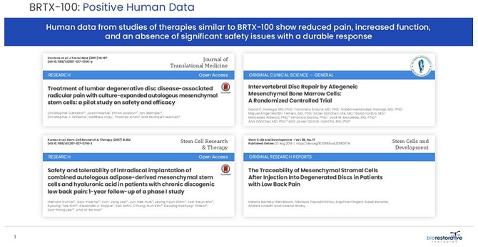 We are currently pursuing our Disc/Spine Program with our initial investigational therapeutic product being called BRTX-100. In March 2022, a United States patent issued in our Disc/Spine Program. We are conducting a Phase 2 clinical trial investigating the use of BRTX-100 in the treatment of chronic lower back pain arising from degenerative disc disease. We have also obtained U.S. Food and Drug Administration, or the FDA, Investigational New Drug, or IND, clearance to evaluate BRTX-100 in the treatment of chronic cervical discogenic pain.